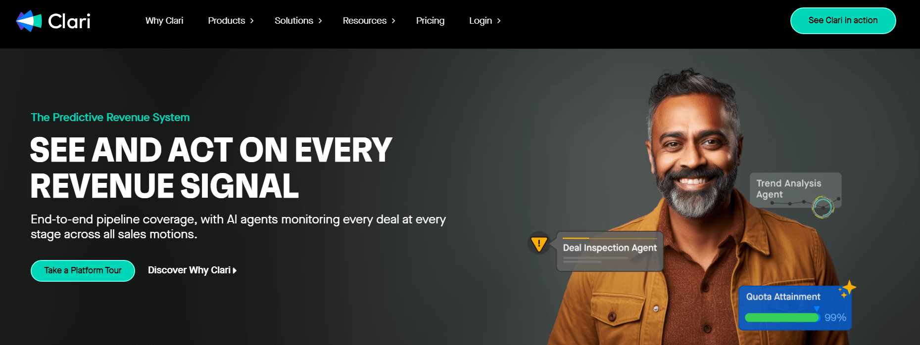 Clari is an AI-powered system that helps with forecasting, pipeline inspection, and revenue operations by bringing together CRM data, activity signals, and engagement metadata.