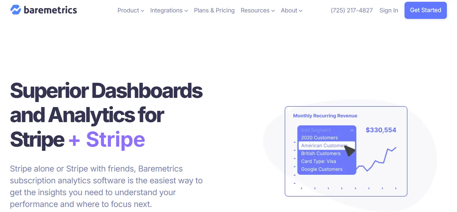 Baremetrics is a reporting tool for SaaS that focuses on standard metrics like MRR, ARR, churn, LTV, and ARPU.
