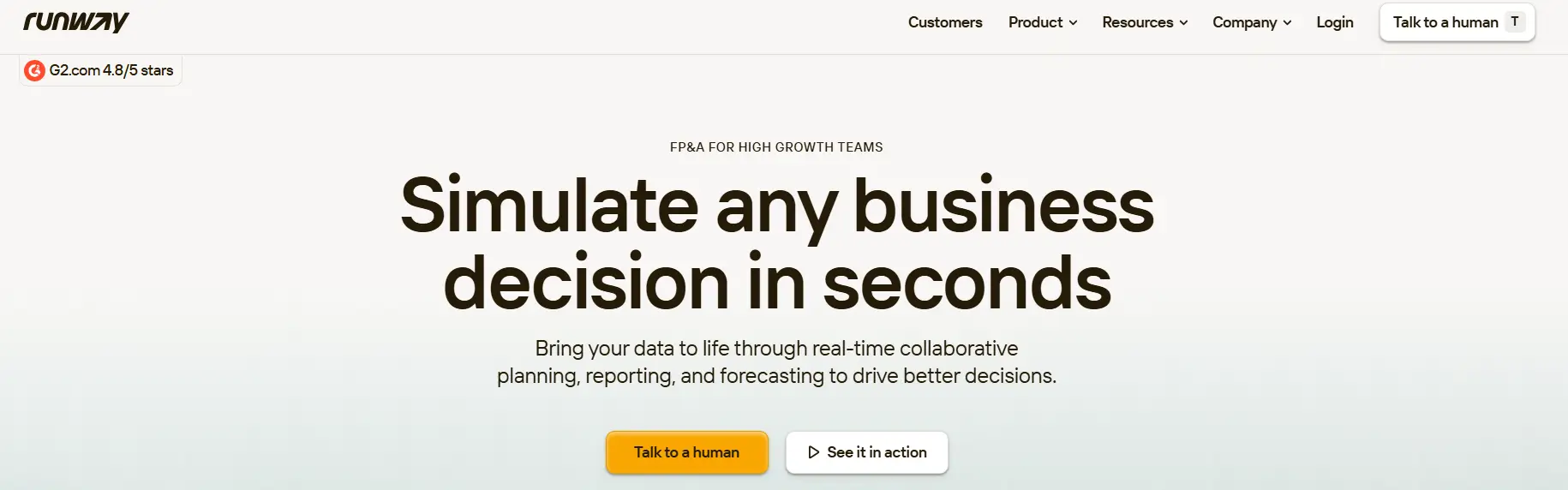 Runway is a financial software that focuses on planning, forecasting, and scenario analysis instead of static reporting. Finance teams can make dashboards for comparing budgets to actuals, cash flow, and headcount while keeping track of changes and audit trails.