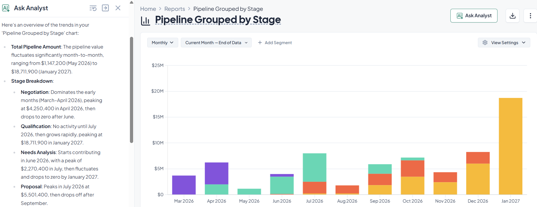 Be mindful that the accuracy of pipeline forecasting depends on clear stage definitions and correct deal updates. The forecast gets too optimistic if deals move stages too quickly.